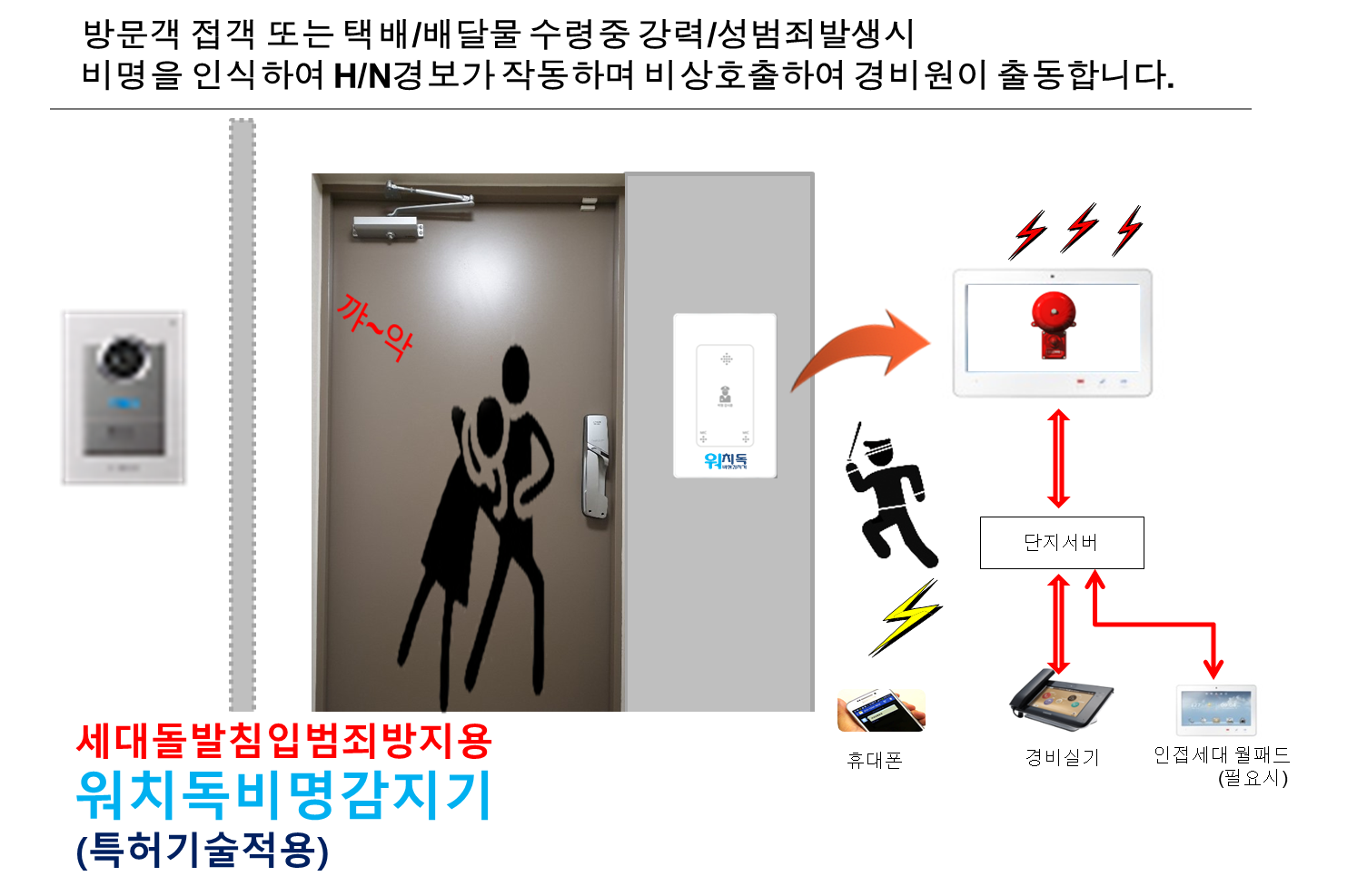 HN연동 비명감지기는 정상적으로 현관문을 열고 방문객을 접객중 거주자인 어린이 또는 여성이 위협을 느끼거나